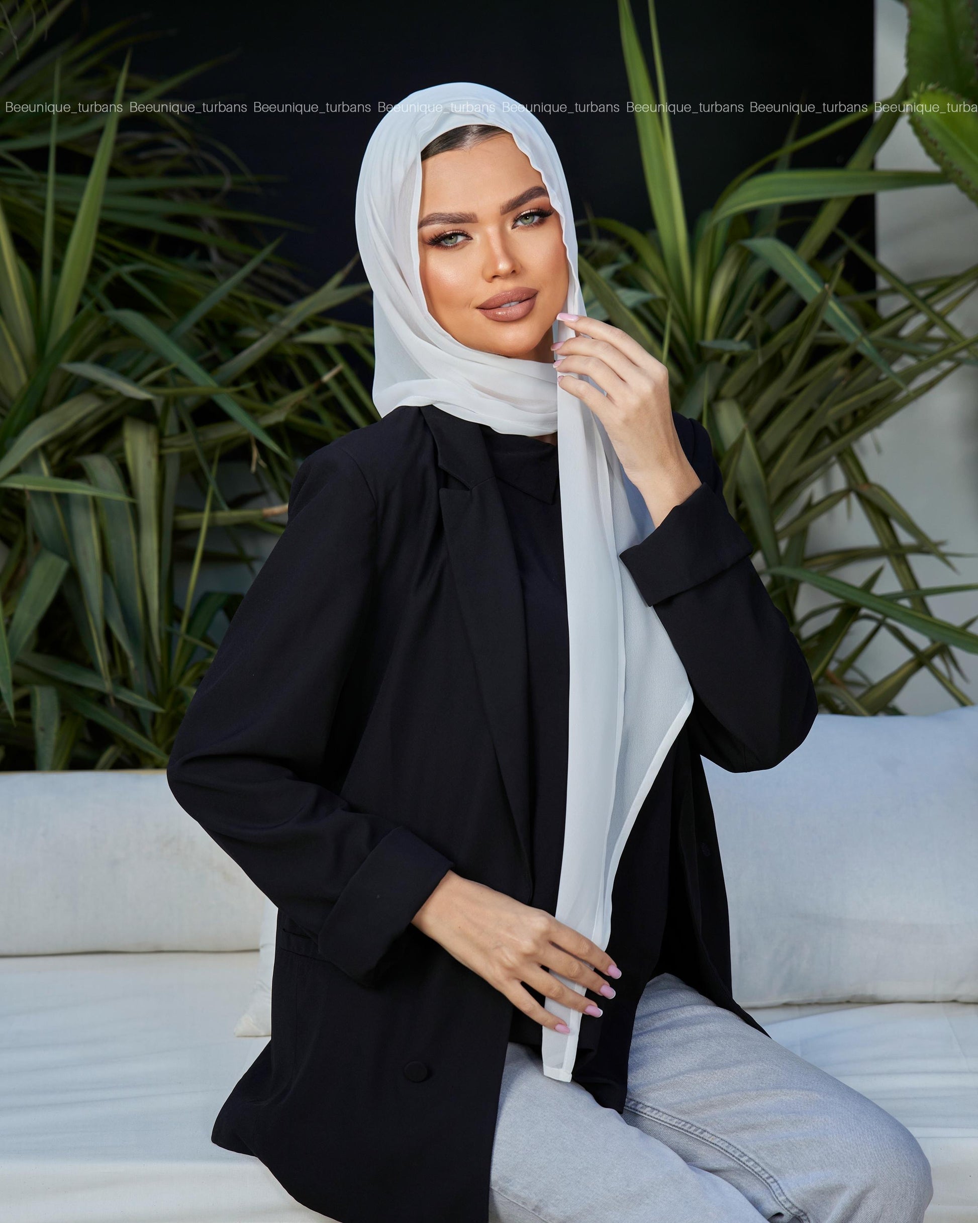 Lightweight chiffon scarf with a hoodie-style fit.