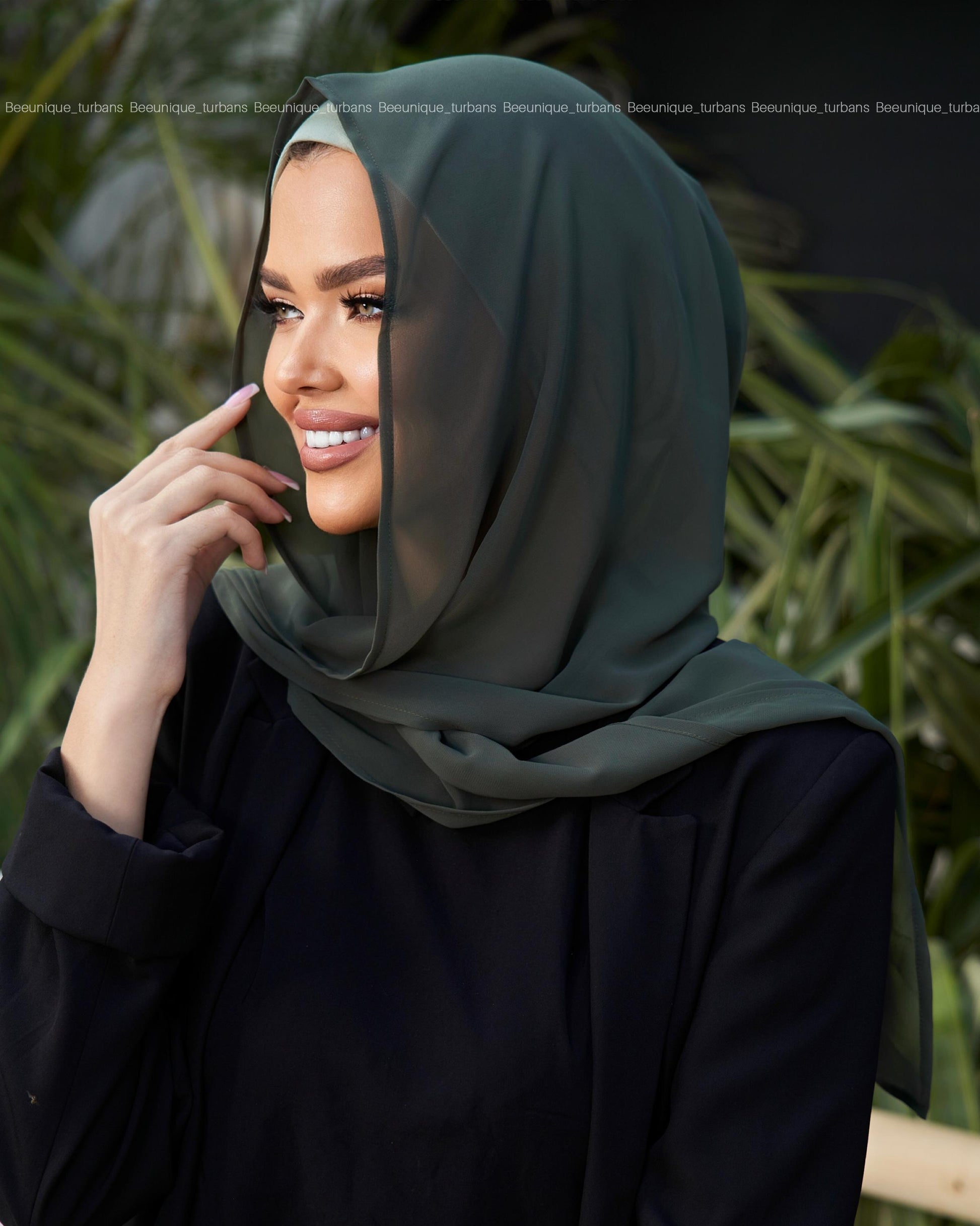 Lightweight chiffon scarf with a hoodie-style fit.